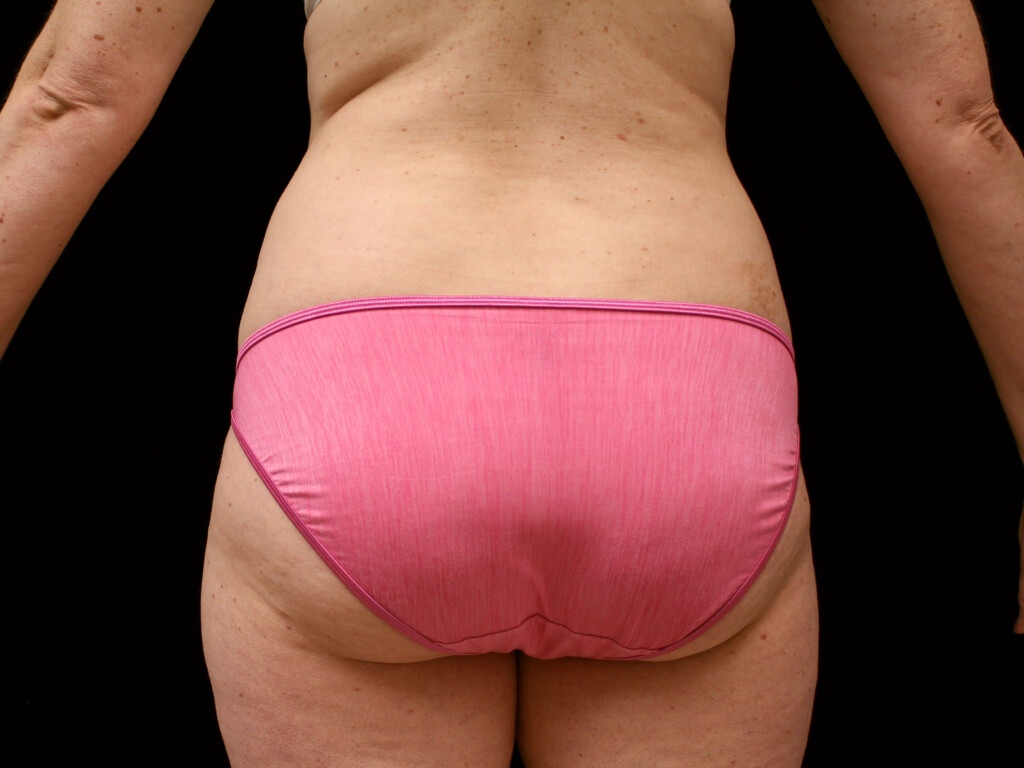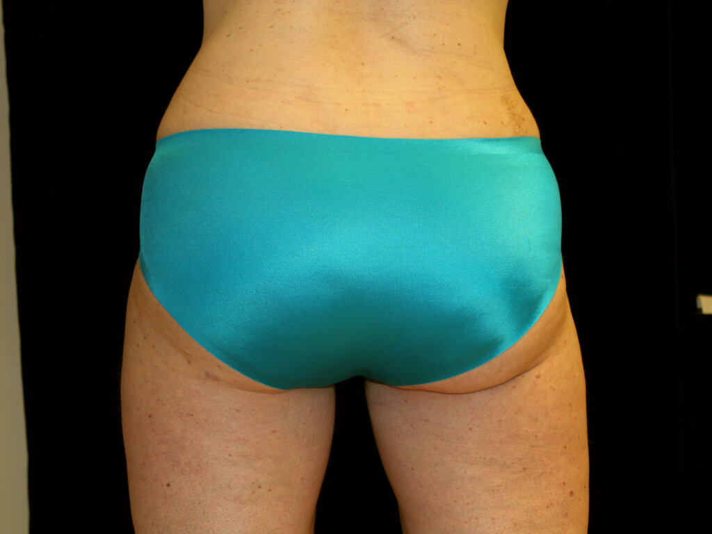 This is a 42 y.o. female who is 5 7 and weighs 133 lbs and presents with lipodystrophy of the flanks, inner and outer thighs. She underwent Power-Assisted Liposuction (PAL) of these areas, and post-operative photos are seen 9 months after surgery.