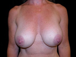 CASE DESCRIPTION: Santa Rosa, California A 48-year-old resident of Santa Rosa, California, and presents to the Marin County Novato office for breast revision surgery. Her initial surgery was performed approximately 10 years ago. At that time, she had placement of 300cc normal saline breast implants in the sub-muscular space. She achieved a nice natural appearance. Over the next 10 years she developed a leak of the right normal saline implant and desired to have them exchanged for silicone implants. Of note, over the years one can see how the breast tissue has stretched, the nipple position has changed, and the quality of her skin has changed. She did not desire to have a breast lift. She underwent her surgery at Dr. Delgados private surgical facility, Marin Cosmetic Surgery Center in Novato, Marin County, California