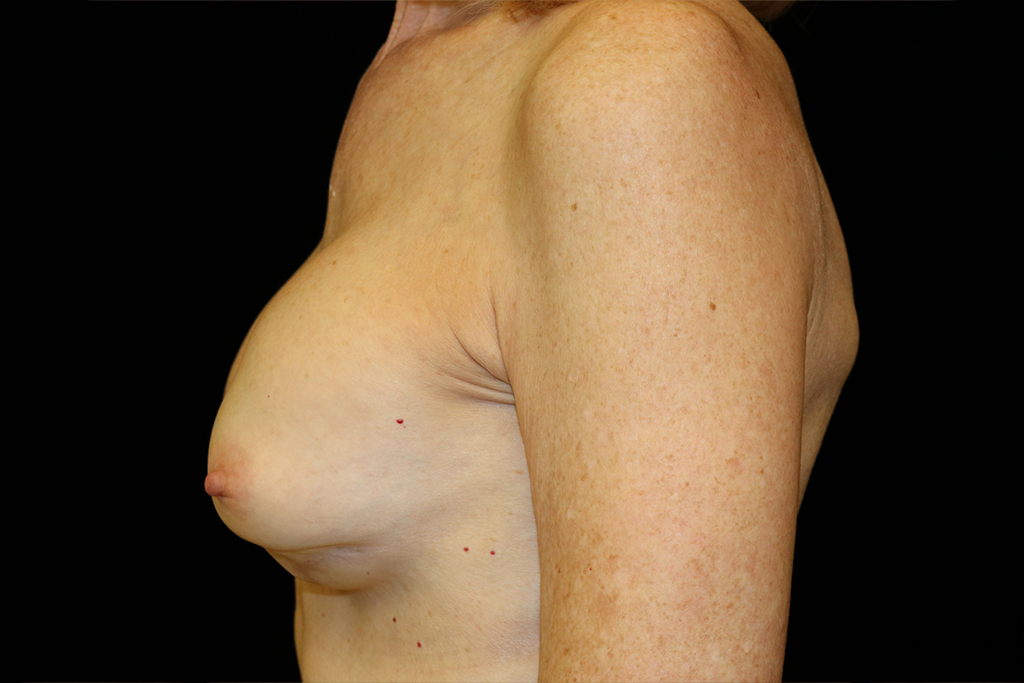 This patient is a 55-year-old female who has had five surgeries for breast implant revision. She presents with complaints of capsular contracture and deformity of the left anterior pole of her breast, and malposition of the implants. She underwent capsulectomy (removal of scar tissue) with the placement of Stratus (treated human skin used for reconstruction) at the inferior pole of the breast. The patient is seen approximately six months after surgery with significant symmetry improvements and inferior breast pole. She was born with a nipple-areola asymmetry with the left nipple pointing outward.