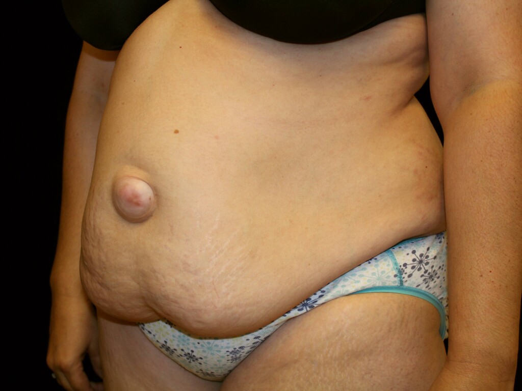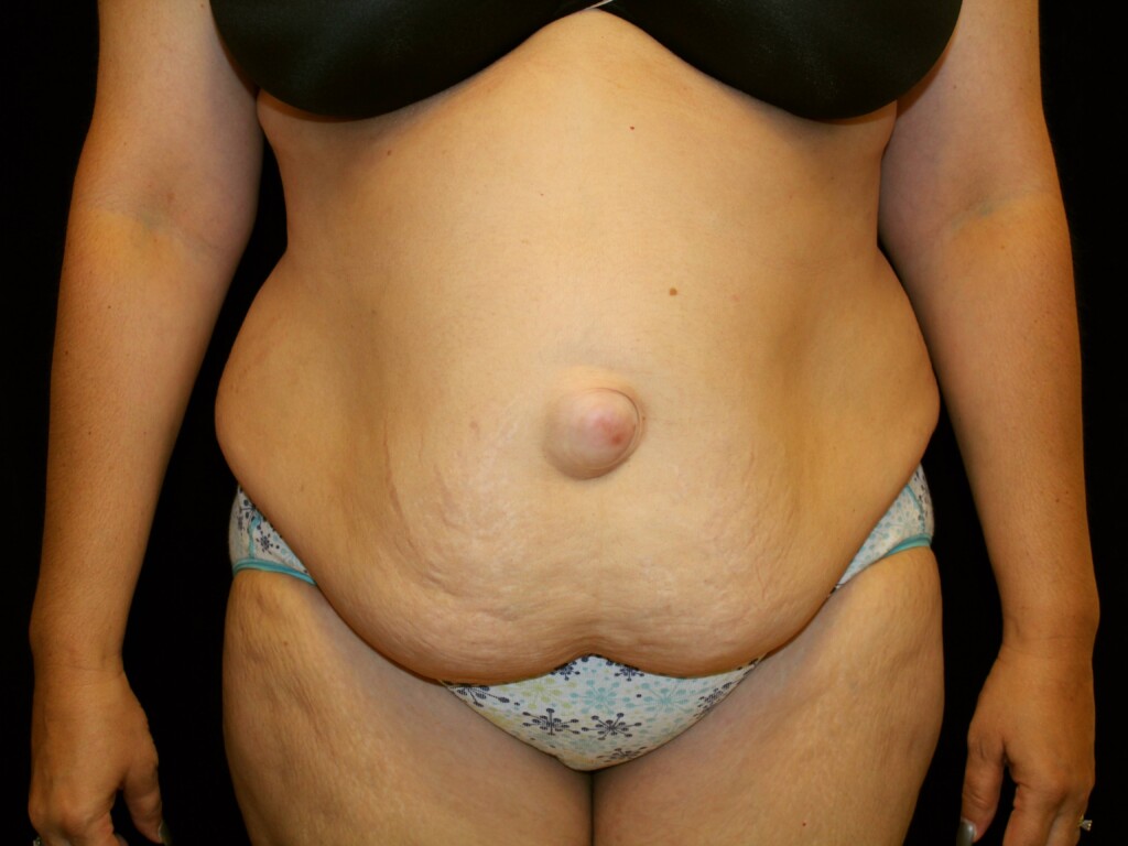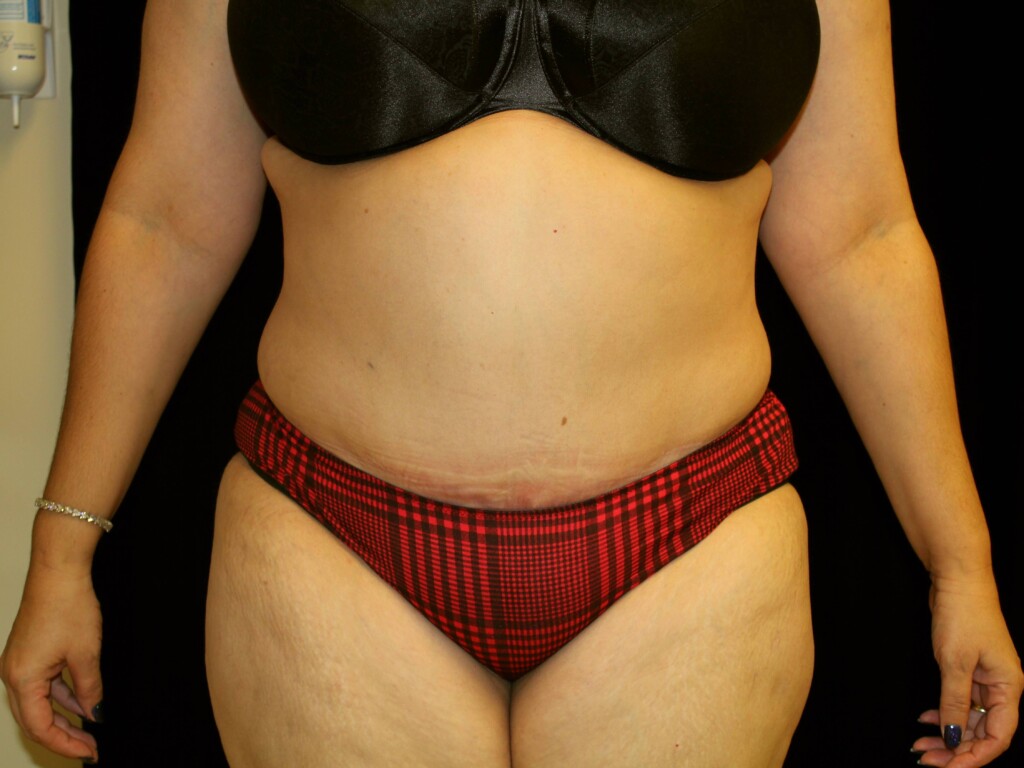 This is a 42 y.o. female 55 and 170 lbs who has completed her childbearing years. She has undergone a tummy tuck with muscle repair (diastasis recti). In addition, she had liposuction of the flanks. She is seen 3 months after surgery. Note the absence of the belly button. It was destroyed by the umbilical hernia. A new belly button can be constructed at a later time. Observe the tight abdomen and the improved waist contour.