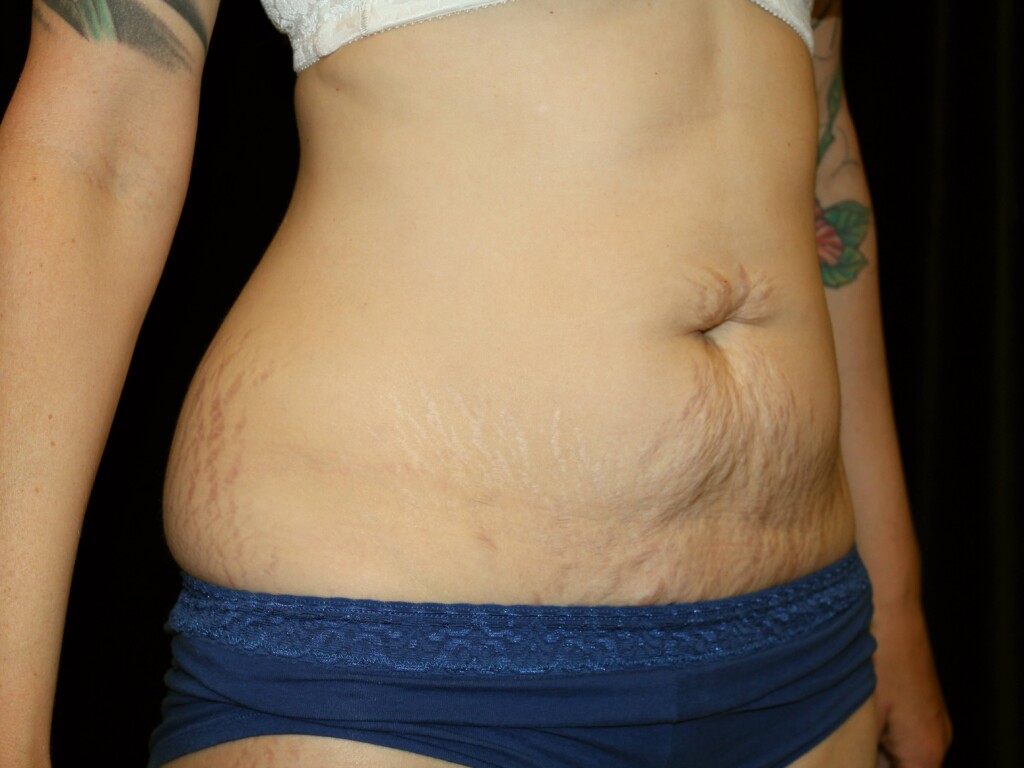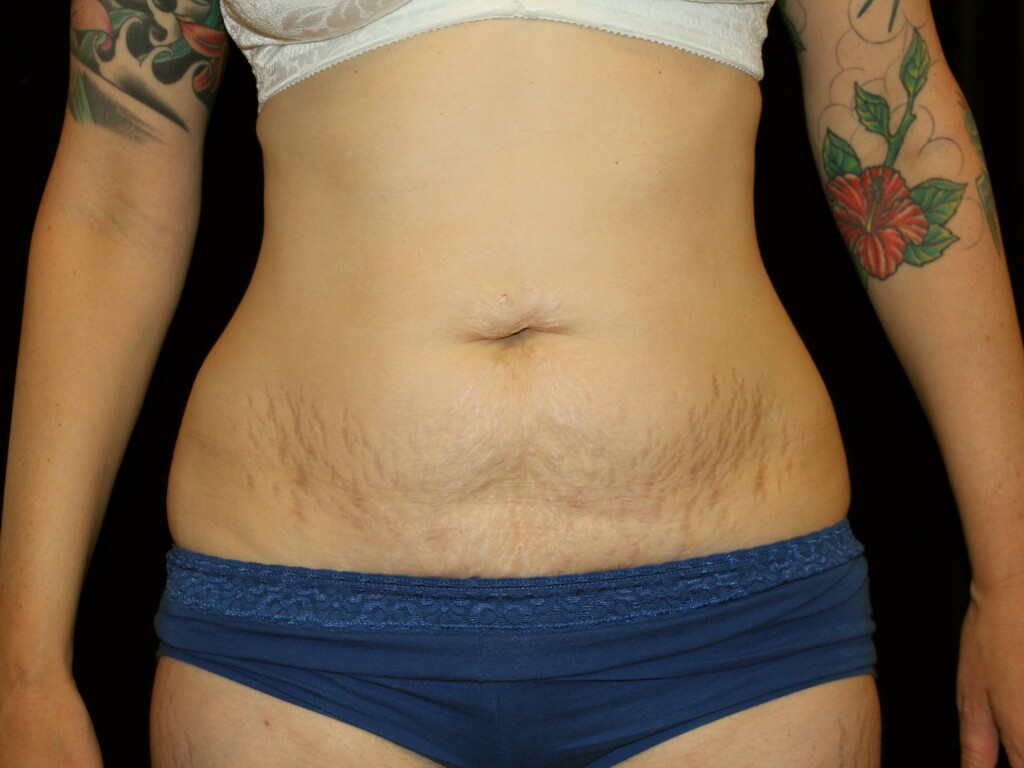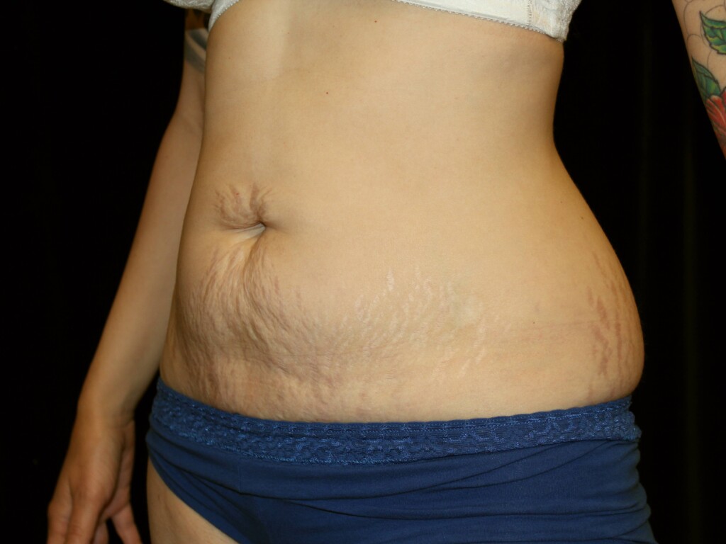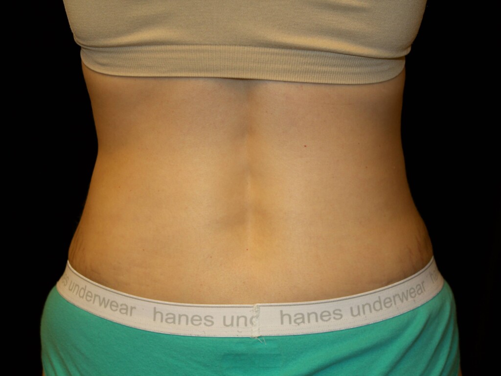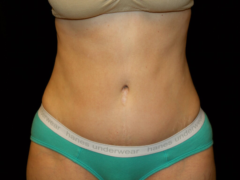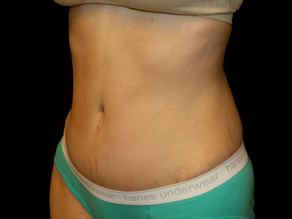 This is a 36 y.o. female 55 and 142 lbs who has completed her childbearing year. She has undergone a tummy tuck with muscle repair (diastasis recti). In addition, she has had liposuction of the flanks. She is seen 5 months after surgery. Note the disappearance of the stretch marks and nicely contoured waist.