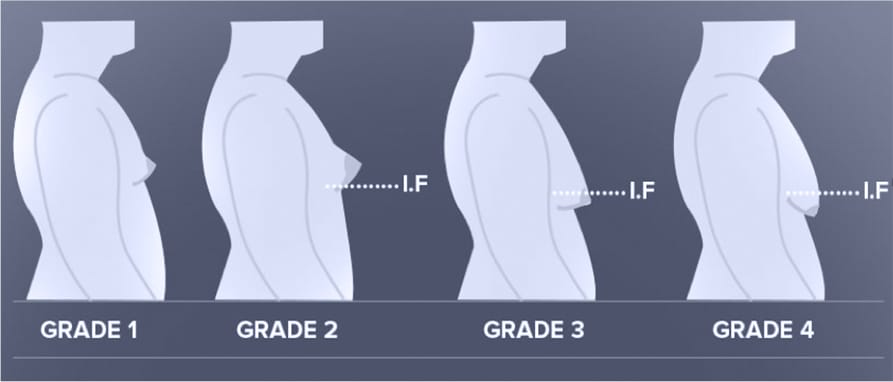 Grade 3 gynecomastia is characterized by skin laxity—the skin begins to sag from the fold (inframammary fold or IMF). The treatment of this grade could be gland excision with liposuction through a Webster incision, a superior crescent lift, or a two-stage procedure. There is more variability with this grade, and the treatment depends on the quality of the skin and the patient’s age. Correcting this grade of gynecomastia depends on the amount of glandular breast tissue and the sagginess of the skin.